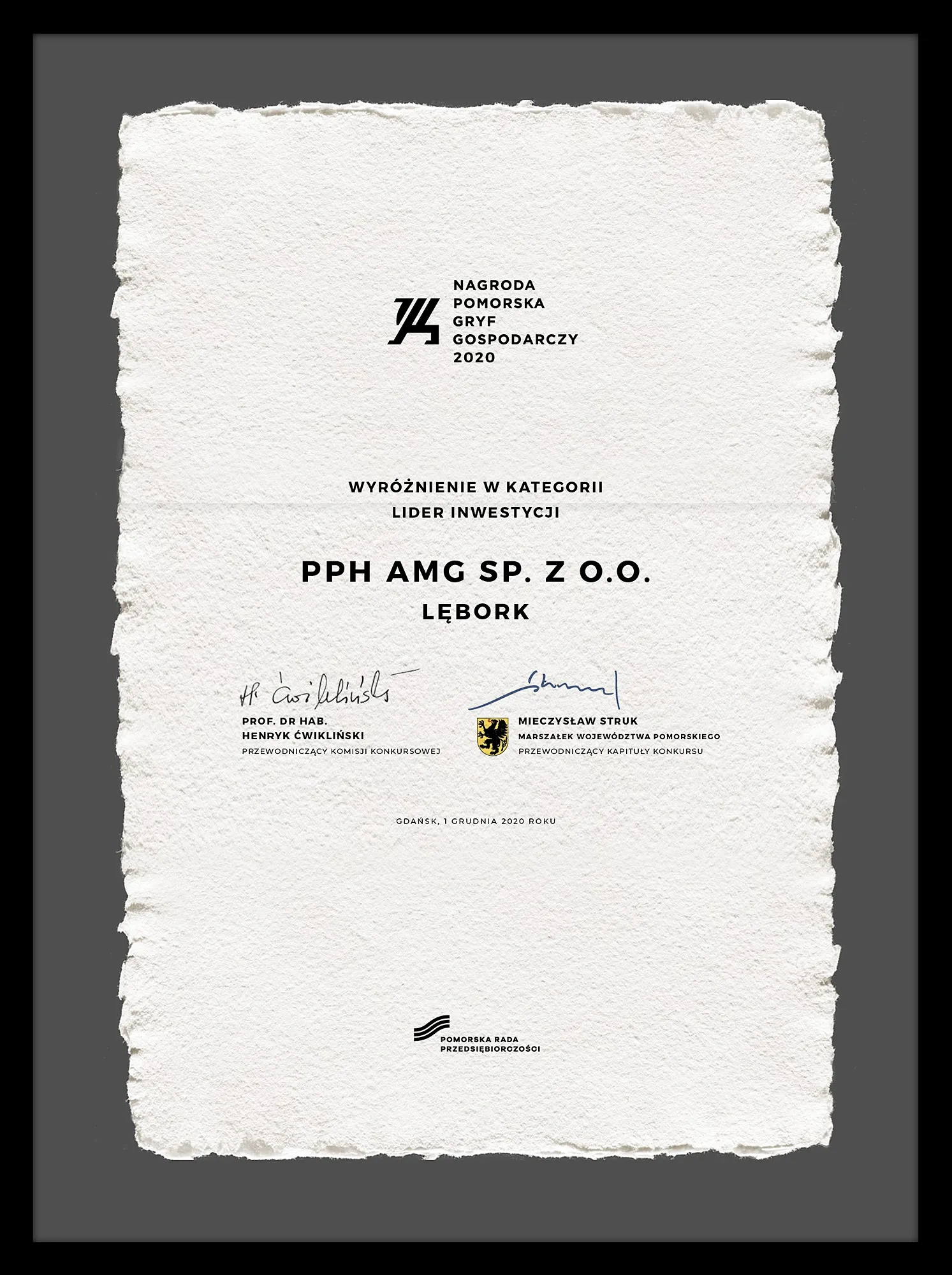 PPH AMG Sp. z o.o. posiada certyfikat Systemu Zarządzania Jakością ISO 9001:2015 oraz ISO 14001:2015 obejmujący „Produkcję kontenerów, pojemników metalowych i konstrukcji stalowych”. Po raz pierwszy certyfikat został nadany przedsiębiorstwu w maju 2000 roku. Jednostką certyfikującą był Lloyd’s Register Quality Assurance Limited. Przedsiębiorstwo posiada także certyfikat oraz uprawnienia nadane spawaczom przez DNV (Det Norske Veritas) do produkcji kontenerów na platformy wiertnicze typu Offshore.
